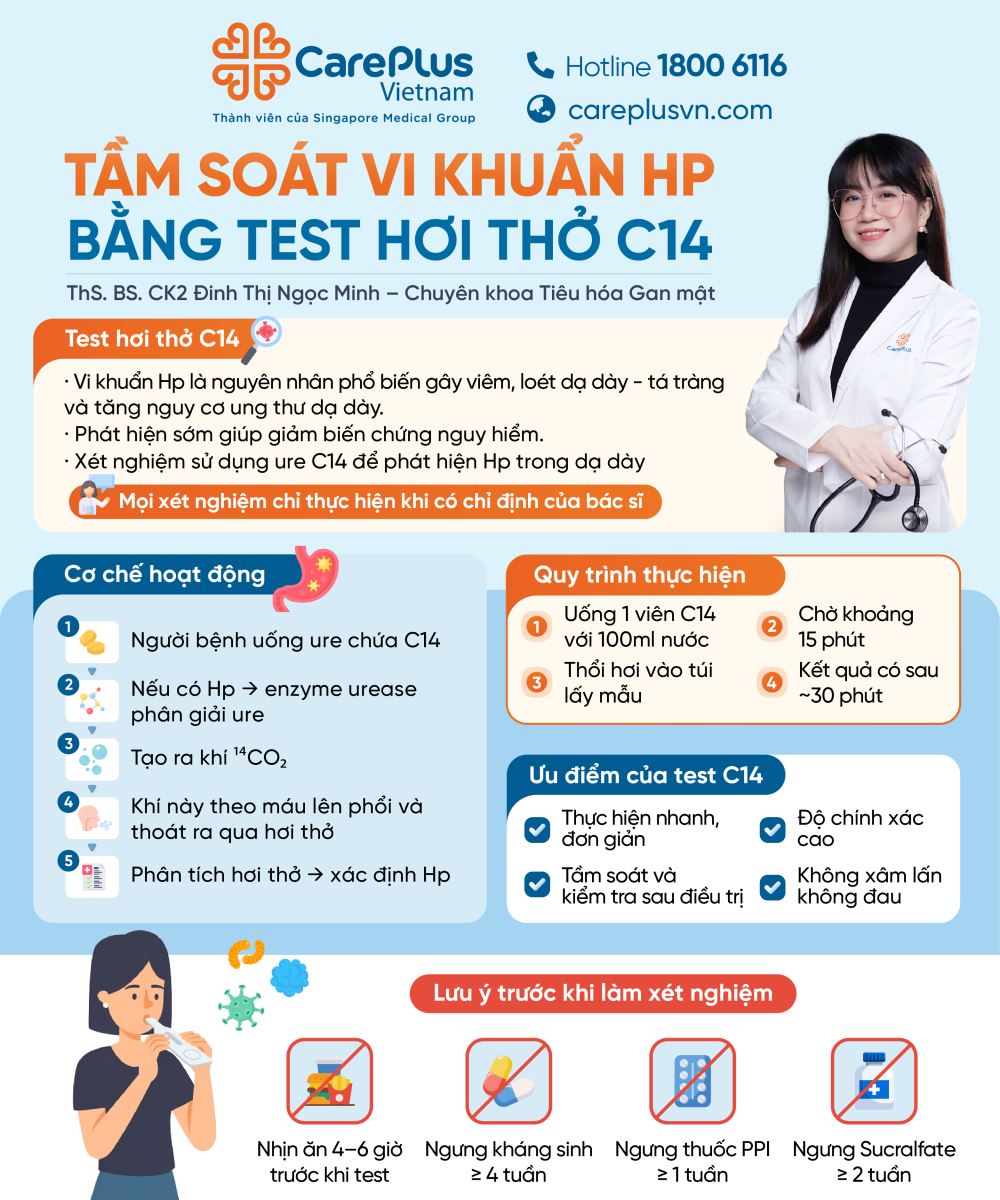 📌 Hiện nay, test hơi thở C14 là phương pháp thuận tiện giúp phát hiện Hp và theo dõi hiệu quả điều trị. Tuy nhiên, xét nghiệm này chỉ cho biết có hay không sự hiện diện của vi khuẩn Hp, không đánh giá được tình trạng niêm mạc dạ dày hoặc mức độ tổn thương như nội soi. Do đó, một số bệnh lý như viêm nặng, polyp hay khối u đường tiêu hóa trên có thể không được phát hiện.