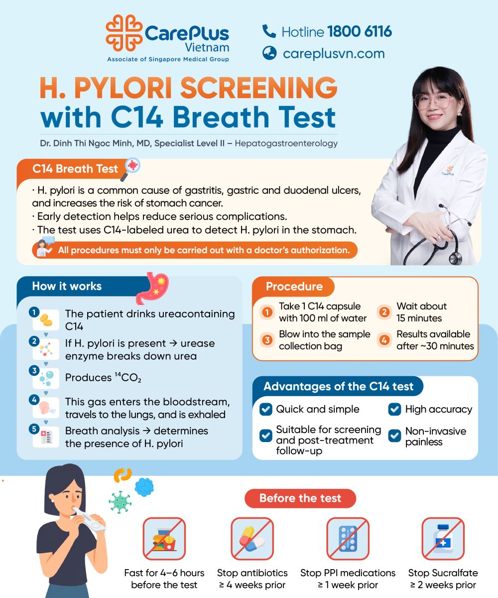 📌 The C14 breath test is a convenient method for detecting H. pylori and monitoring treatment effectiveness. However, it only indicates the presence of the bacteria and cannot assess the condition of the stomach lining or detect structural abnormalities like endoscopy can.