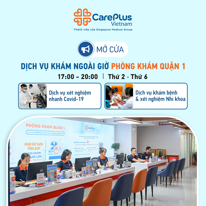 To bring customers the most convenient and quality service experiences, from 1 July 2022, District 1 CarePlus clinic extends the working hours from 17:00 to 20:00, Monday to Friday, for Pediatric services, Pediatric Laboratory, and Covid-19 Rapid Testing.