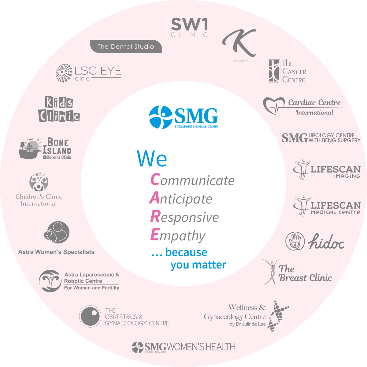 Singapore Medical Group (SMG) is a private specialist and primary healthcare provider with a network of more than 25 medical specialties. SMG has more than 40 clinics strategically located across Singapore's prime locations and other suburban locations with a growing network of SMG Associates clinics all across the island.