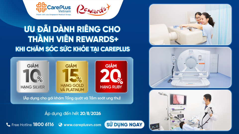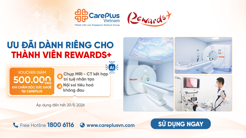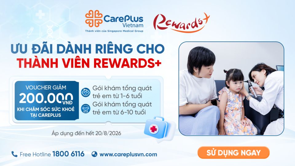 Đổi điểm trên ứng dụng Rewards+ ngay để nhận ưu đãi khi chăm sóc sức khỏe tại Hệ thống Phòng khám Quốc tế CarePlus.
